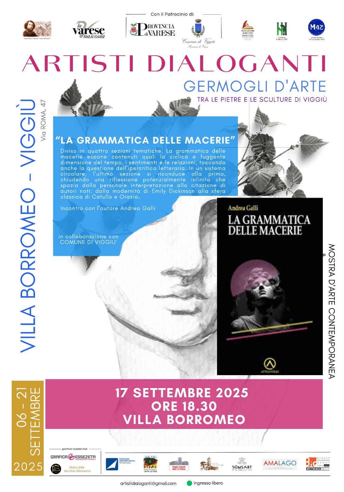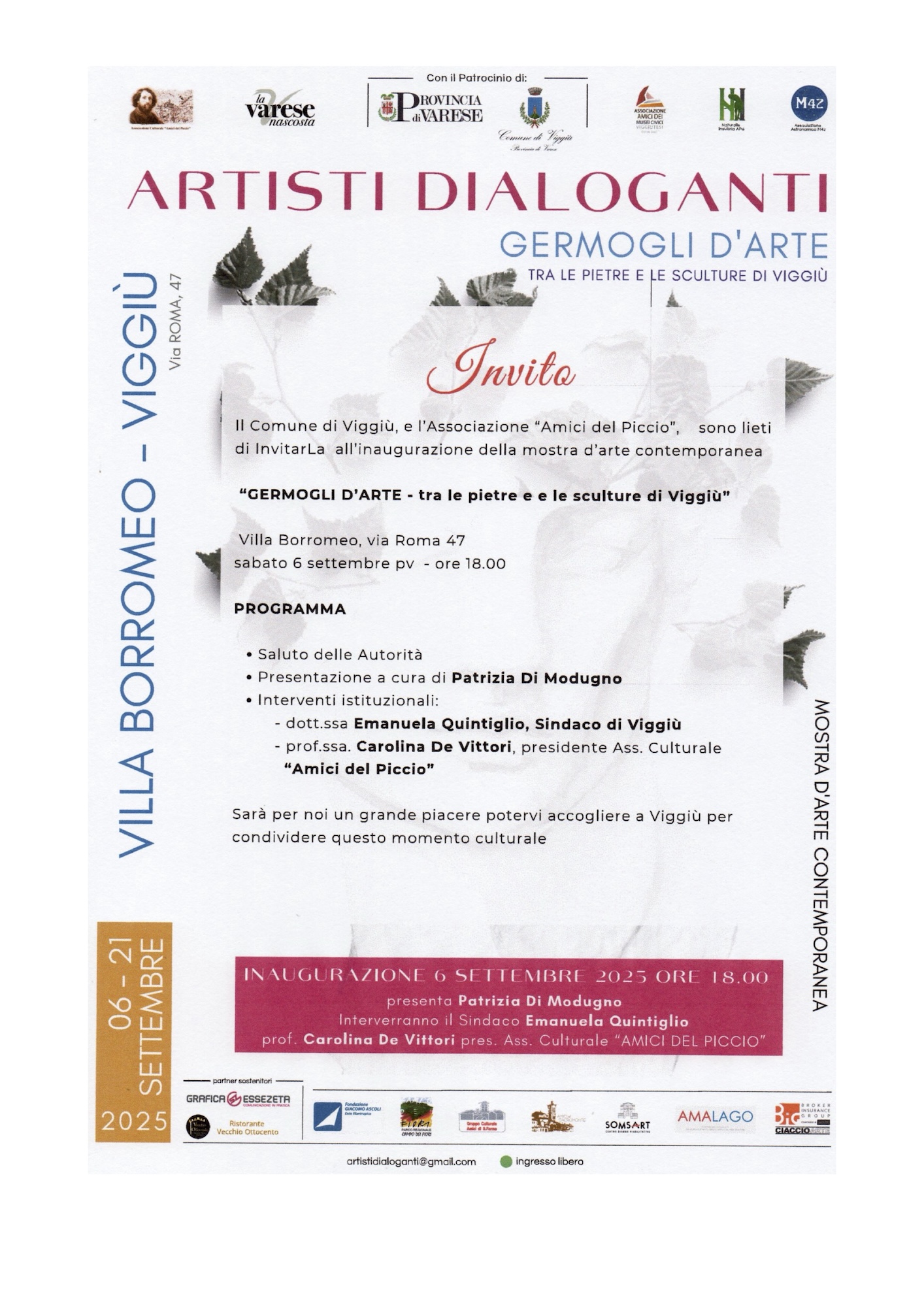 Artisti dialoganti. Germogli d'arte tra le pietre e le scultura di Viggiù Inaugurazione 6 settembre 2025, ore 18.00 Presenta Patrizia Di Modugno. Interverranno: Emanuela Quintiglio (sindaco di Viggiù) e Carolina De Vittori (presidente Associazione culturale “Amici del Piccio”) Comunicato stampa Invito |