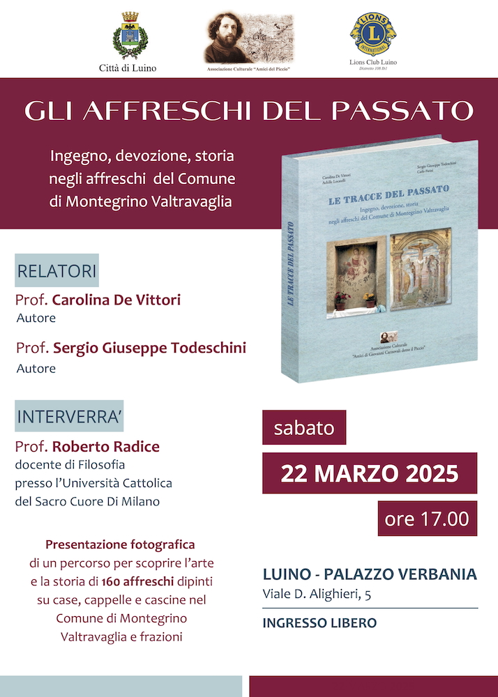 Gli affreschi del passato Ingegno, devozione, storia negli affreschi del Comune di Montegrino Valtravaglia Relatori gli autori Carolina De Vittori e Sergio Giuseppe Todeschini Interverrà Roberto Radice (professore di Filosofia dell'Università cattolica del Sacro Cuore) Locandina |