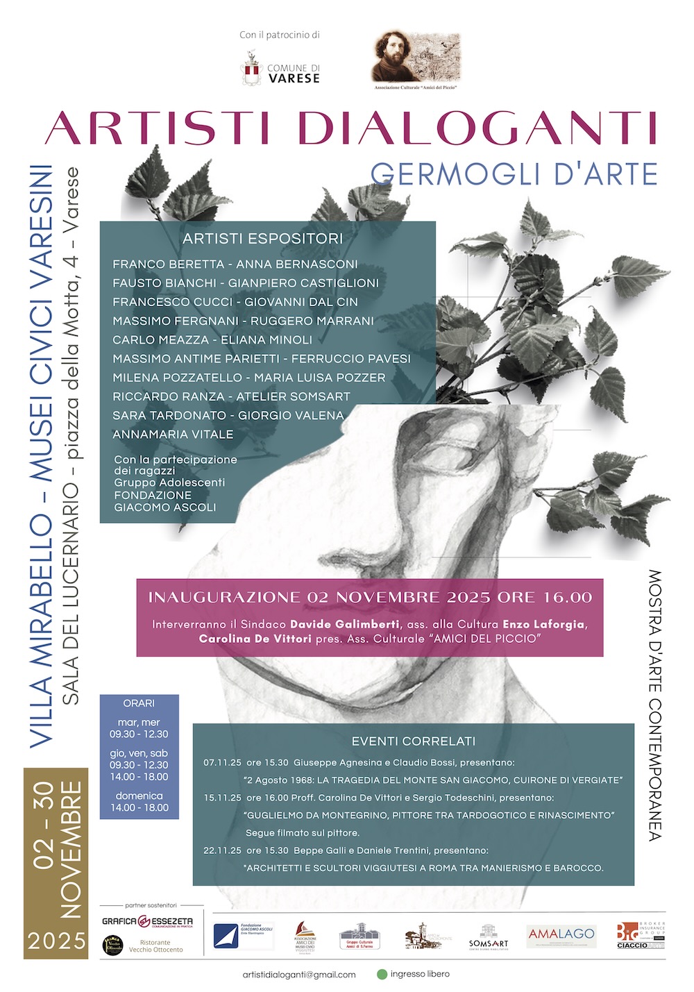 7 agosto, Montegrino, Ristorante “Il Vecchio Campegino” CENA con gli AMICI del PICCIO 6-21 settembre, Viggiù - Villa Borromeo, mostra “Artisti dialoganti - Germogli d’arte tra le pietre di Viggiù” organizzata dai soci Ferruccio Pavesi e Tiziana Riva con la partecipazione di un gruppo di artisti del Varesotto, arricchita da alcuni eventi collaterali, patrocinata da Associazione “Amici del Piccio”, Comune di Viggiù, Provincia di Varese e altri. 14 settembre, Viggiù, mostra nei cortili, organizzata dai soci Ferruccio Pavesi e Tiziana Riva con la partecipazione di un gruppo di artisti del Varesotto, patrocinata da Associazione “Amici del Piccio”, Comune di Viggiù, Provincia di Varese e altri. 5 Ottobre, ore 16.00 - Montegrino, palazzo comunale, cerimonia di donazione di un “Affresco su tela - Madonna Addolorata” dell’artista Gianpiero Castiglioni. 1-30 novembre, Villa Mirabello Varese, mostra “Artisti dialoganti” - da definire. 29 Novembre 2025/ 4 gennaio 2026, mostra “Artisti dialoganti, l’arte che unisce”, organizzata da F. Pavesi e T. Riva con la partecipazione di un gruppo di artisti del Varesotto, arricchita da alcuni eventi collaterali. Patrocinata da Associazione “Amici del Piccio” e Comune di Luino - Luino, Palazzo Verbania. Locandina eventi |