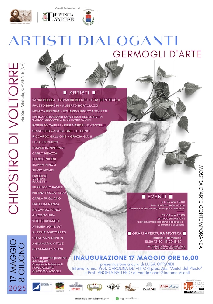 Inaugurazione della mostra "Artisti dialoganti - Germogli d’Arte" Visitabile dal 17 maggio all'8 giugno 2025 il sabato e la domenica (10.00-12.30 e 15.00-18.30) Locandina della mostra |